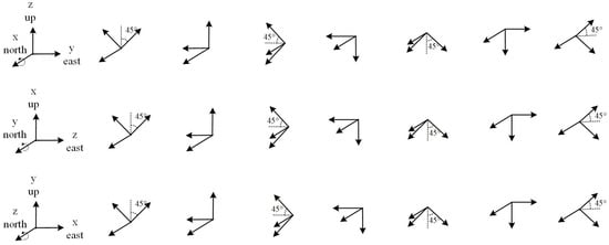 Based on the above analysis, 24 measurement positions are designed as shown in Figure 1. To start with, the 24 positions of the triaxial accelerometer are divided into three groups, and the three axes are respectively used as the rotation axes of the three groups. Next, the rotation axes of the three groups all point north, then the triaxial accelerometers rotate 45 degrees anticlockwise successively around the rotation axis, each group rotates 7 times, and the three groups have 24 positions in total. In addition, since the proposed method of in-field calibration does not rely on external equipment, the direction of each position does not need to be precisely aligned.