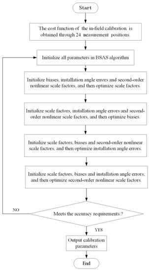 It is worth noting that for the purpose of getting higher calibration accuracy, 15 parameters may need to be optimized many times. Therefore, the above steps can be repeated until the requirements are met. The 15 parameters optimization flowchart of the in-field calibration based on BSAS algorithm is shown in Figure 2.