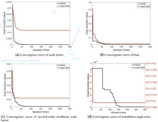For simplicity, Figure 4 is the convergence curve of the four types of calibration parameters in a simulation experiment. By comparison, it can be found that the curves of two different colors both have the fastest descent speed in the first 20 iterations, and the convergence speed of the BSAS algorithm exceeds the basic BAS algorithm. After 20 iterations, the basic BAS algorithm completes the optimization in advance and is trapped in the local optimal value. In Figure 4d, for the calibration of installation angle error parameters with high accuracy requirements, the basic BAS algorithm can hardly optimize it, while BSAS algorithm can jump out of the local optimal value and continue to search after 60 iterations. Therefore, in terms of convergence speed and global optimization capability, the BSAS algorithm is superior than that of basic BAS algorithm.