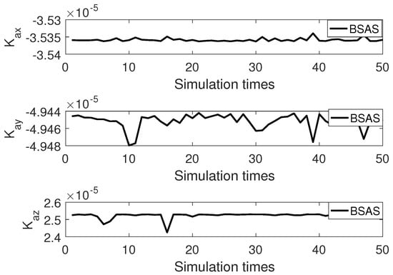 Figure 3 shows the optimization effect of BSAS algorithm with different parameters. In terms of position update probability constant , as shown in Figure 3c,f,i,l, is directly affect the convergence speed and efficiency of the algorithm. With the increase of , the convergence speed of the algorithm has significantly improved. In addition to the convergence speed, the number of beetles m and step size update probability constant also affect the optimization ability of the algorithm. As shown in Figure 3a,d,g,j, when the number of beetles m is 10, after 300 iterations, the cost function values for optimizing the four types of calibration parameters are , , and . When m is 6, the values are , , and , and when , the values are , , , and . Similar to the number of beetles, Figure 3b,e,h,k shows the parameter also affects the optimization results.