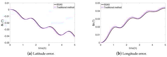 Figure 10 is the longitude and latitude error curve of 5 hour static navigation with two calibration methods. Firstly, the accelerometer is calibrated by the traditional method, and the latitude error is and the longitude error is . Afterwards, the BSAS algorithm is used to perform in-field recalibration, and the latitude error and longitude error are and respectively, which are better than the results of traditional methods. Moreover, the positioning error can be calculated as Equation (23), where R is the radius of earth, is the latitude error at time t, and is the longitude error at time t. The results are shown in Figure 10.