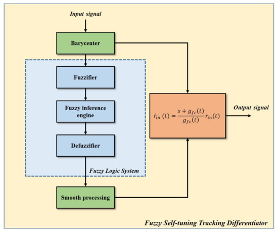 The construction of the proposed fuzzy self-tuning tracking differentiator is demonstrated in Equation (21), where is the differential output of after FATD and is an adaptive time-varying parameter.