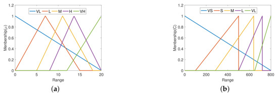 The membership function (MF) is a triangle function. The input membership function (IMF) is shown in Equation (11), and The output membership function (OMF) is shown in Equation (12). The graphical representations of membership functions are shown in Figure 3.
