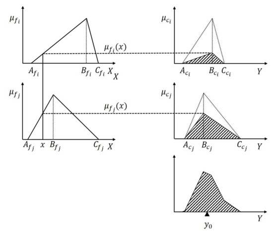 The process of the fuzzy logic system is shown in Figure 4. (a) Inference: From the IMF, a truth value is obtained. For each truth value, the OMF is scaled by multiplication, and is obtained. It is shown as Equation (13). (b) Aggregation: Combine the resulting curves using the SUM operator. The curve sum operation is expressed as . It is shown as Equation (14). Where is the combined curve. (c) Defuzzification: find the center-of-weight of the area under the curve . It is shown as Equation (15). The position of this center is then the final output, where is the functional expression of curve .