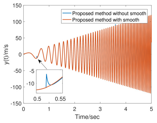 where refers to smoothed , is the output amplitude of the function, affects the width of the smooth zone, and affects smooth zone center. In Figure 5, both smoothed and unsmoothed tracking differentiator outputs in the simulation are given. We shortly conclude that adding a smoothing link effectively avoid chattering caused by parameter switching.