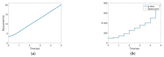 Figure 2a shows the signal of Equation (9), where , , , and n is a gaussian noise with a mean of 0 and a standard deviation of 0.001. Figure 2b shows the frequency barycenter analysis result.