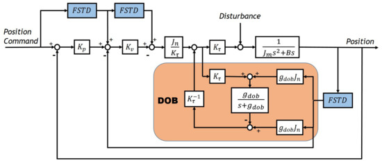 Figure 9 shows the block diagram of the control system. The control system employs a combination of PD controller, Disturbance observer (DOB), and a feedforward controller. The system is a typical angular position control system. The motion measurement sensor obtains the angle value response, and the control command is the angle value. There are many differentiating operations existing in the system: PD controller needs angle value response and speed value for feedback control; the DOB needs speed value to estimate disturbance [21]; the feedforward controller needs the commanded speed and acceleration to compensate for the phase.