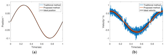 Figure 10 shows the encoder output and a differential speed at 1 Hz. The adaptive bandwidth of FSTD is 79.47 rad/s. Obviously, the tracking differentiator shows excellent filtering performance, and the phase lag of the differential is also acceptable due to the presence of feedforward controller. Figure 11 shows that in terms of the angular velocity error, FSTD better than TTD.