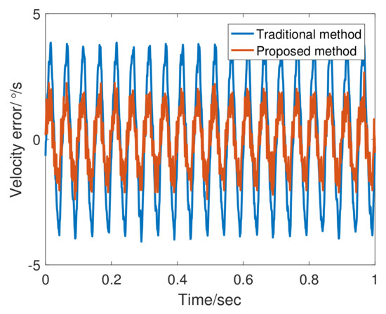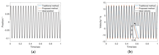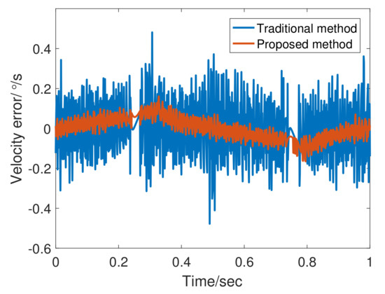 Figure 12 shows the encoder output and velocity at 20 Hz. the adaptive bandwidth of FSTD is 748.21 rad/s. The phase lag of FSTD is smaller. From the error curve shown in Figure 13, the phase lag component is greater than the noise component in the 20 Hz signal error. Therefore, compensating for phase lag can more effectively reduce errors. FSTD is better than the traditional method.