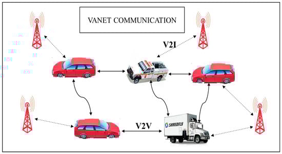The vehicular ad-hoc network () has similar characteristics to the Mobile Ad-Hoc Network () where the vehicle is mobile in nature and controlled by road topologies []. The objective of is to provide the driver and user with a safe and reliable communication environment. The communication in can be broadly classified into a vehicle to vehicle (), vehicle to infrastructure or roadside unit () () and , which is a combination of both and . The basic architecture of VANET communication is shown in Figure 1. Each vehicle is embedded with an onboard unit () that has communicational and computational capabilities [].