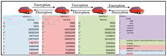 Each vehicle computes its public and private key using the proposed commutative RSA algorithm. Hop-based communication is adopted for data transmission among vehicles. Each vehicle encrypts the data using its own public key. The receiver performs decryption operation based on the number of times it is encrypted using its commutative keys of participating vehicles. The proposed model preserves the data and user’s privacy, and an intruder can be tracked using the user’s commutative keys. First, we established the key management where the key management center will distribute two prime numbers A and B to all VANETs, which are the same. Then, we will calculate L and M at each VANET node. Based on this, two vehicular nodes will compute the encryption and decryption keys. Second, we established the key exchange; now, once all the vehicles completed their encryption and decryption keys, they will inform the key management that it’s over. For instance (Figure 2), Vehicle 1 is the source and Vehicle 4 is the destination. Vehicle 1 has to send the data to Vehicle 4. So, what could happen is that the intermediate hops are Vehicle 2 and Vehicle 3. So, Vehicles 1, 2 and 3 will send their decryption key to the key management center, who will give these keys to only the destination vehicle, which is Vehicle 4. In secure data exchange, Vehicle 1 will then encrypt the data and send it to Vehicle 2. In normal RSA or normal Elliptic-curve cryptography (ECC), when you encrypt encrypted data again, data gets corrupted. So, on decryption, the data cannot be recovered (data lost). So, in our mechanism, the user does not need to decrypt the data; the user can just encrypt using his key and forward it. If there is an attacker that knows I’m Vehicle 3, now this attacker will not have the same encryption key. However, all the encryption keys are different from each vehicle, so the attacker will not be able to get the data. Even if the attacker gets the data, he will not be able to decrypt it because all the decryption keys are also different, and the attacker will not know how many times the data is encrypted. So, in this case, no one other than Vehicle 1 and Vehicle 4 will get to know the original data. That is the biggest advantage of securing complete VANET transmission. In addition, another advantage of this protocol that the intermediate nodes will not get to know the data content at all, because the data is encrypted multiple times and these multiple encryptions do not crop the data. In the normal RSA or ECC, every time you need to decrypt your data and then again re-encrypt it, because it does not support multiple encryptions and multiple decryptions.