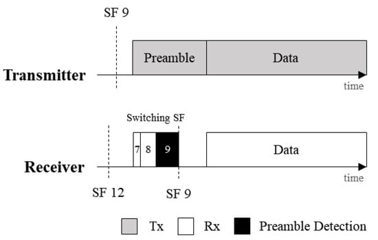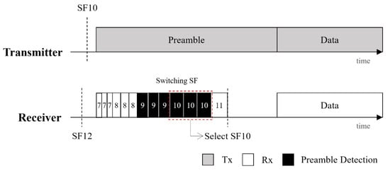 To check the presence of LoRa signals, channel activity detection (CAD) is performed. The CAD mode efficiently detects the LoRa preamble signal [7,8]. A receiver in CAD mode only detects a preamble with a matching SF. In the ASFS, the receiver inspects the preamble by sequentially changing its SF from the lowest value (SF7) to the highest value (SF12). When a receiver detects a preamble in a specific SF, the receiver learns the corresponding SF of a transmitted packet. As shown in Figure 1, the receiver uses CAD mode to find a proper SF during the preamble period by switching its SF while the transmitter sends a packet with SF9. After this process, the receiver synchronizes the SF with the transmitter and processes the data.