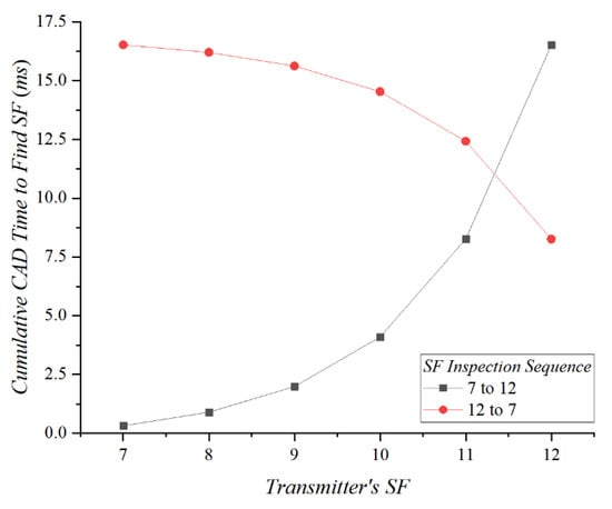 In ASFS, the number of steps in the SF inspection sequence determines the preamble sampling time for finding a proper SF. As in Equation (6), if BW is constant, the CAD time exponentially increases according to the SF value. Figure 2 shows the theoretical cumulative CAD time needed to find the SF of the transmitter by using the SF inspection sequence. If the receiver examines the preamble in ascending order from SF7 to SF12, the average cumulative CAD time is 5.35 ms; the lower SF consumes less CAD time. Alternatively, when the receiver inspects the preamble in descending order from SF12 to SF7, the average cumulative CAD time is 13.92 ms. Because the average cumulative CAD for the descending SF inspection order is more than two times greater, we propose searching SFs in ascending order.
