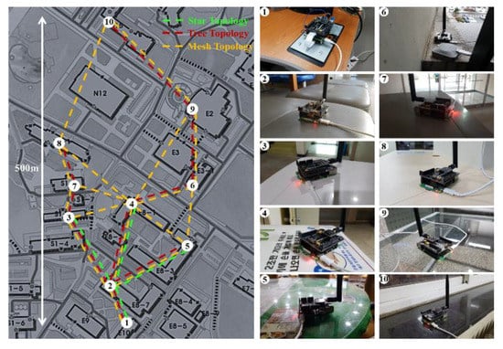 The LoRa modems connected to Raspberry Pi are installed at Chungbuk National University (Figure 5). A star topology connects five modems, and a tree topology and a mesh topology connect 10 modems each. Dotted lines between devices represent the communication links, and the SF used for each link is preset to the smallest possible value for communication. The star topology uses the existing LoRaWAN and the tree topology uses a simple packet forwarding method. We also implement a flooding algorithm used in [6] on the network layer for the mesh topology. The library used for the software implementation is as in [15]. We implemented the ASFS, tree topology, and mesh topology using the library on the SX1272.