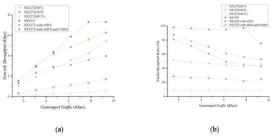 Figure 7 shows the network throughput and packet reception ratio with respect to the generated traffic in the network. The experimental results are the average of 10 data collected over 100 seconds. The network throughput increases as the traffic generated by the network grows. SX1272 shows the highest throughput in SF7, which provides higher data rate than other SFs. However, since the SX1272 gateway cannot receive the packets transmitted by the SF which is not set, the packet reception ratio (PRR) is low as seen in Figure 7b. The SX1301 can receive eight packets simultaneously for all SFs. It shows a much higher throughput and packet reception ratio than the SX1272. The low bandwidth usage of SX1301 makes the channel more saturated than the SX1272. As shown in Figure 7, the throughput and PRR become saturated when the traffic generated by the network is 7.76 Kbps. Nevertheless, the SX1301 still can use additional SFs or channels to further increase a network throughput. This has a great advantage in accommodating multiple devices in the network.