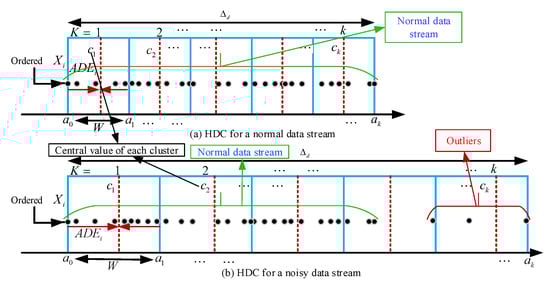 A graphical representation of the histogram-based data clustering (HDC) technique. (a) The HDC performs clustering for a “normal” data stream; (b) The HDC performs clustering for a “noisy” data stream.