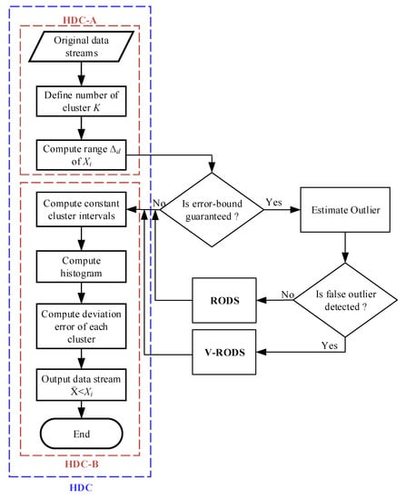 In WSNs, outliers can be defined as the sensor readings that significantly deviate from the normal pattern of the sensed dataset [61]. The outliers can be caused by the sensor malfunction, faulty sensor nodes, noise, and error readings. Two types of outliers might be generated, namely randomly generated outliers and frequently generated outliers. Generally, outliers can dramatically change the normal data pattern and affect the overall data analysis [62]. For example, in Figure 3b, when outliers occur in a data stream , the range of , increases significantly, as well as cluster width W. As a result, the data proximity may be reduced, the central values of the clusters may be shifted, and the deviation error may be increased. Therefore, in this paper, the RODS technique has been introduced with HDC to handle outliers to facilitate the process of determining the number of clusters.