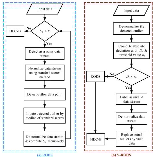 The proposed EDC has been implemented at CH to reduce the temporal correlated data points that are generated from the connected sensor nodes in each cluster. For example, is the collected data points from a sensor node at the CH within a certain period where n is the number of observations of the stated phenomenon. The EDC is executed by the multiple CHs running simultaneously where all CHs are connected with a sink node, either in direct or multi-hop connection. For simplicity, each CH in each cluster is assumed to have equal number of sensor nodes connected to it. Figure 5 presents the flowchart of EDC technique, which provides the histogram-based data clustering and error-bound guaranteed data reduction. As mentioned earlier, the EDC consists of three main modules, the flow of operations for first HDC module is highlighted in Figure 5 and the rest of two modules are presented in Figure 6. The HDC module groups similar data into clusters based on temporal correlation and the data of each cluster are represented by the central value of that particular cluster for in-network data reduction. Thus, the overall changes in environment variables can be monitored efficiently from the remote server by transmitting the reduced set of data instead of a large data stream. However, the closeness between the reduced set of data and original data stream is measured by the deviations between the central value of each cluster and the all data points of that cluster. If the average deviation is too high, then the changes in the trend of the variables might be significant and abnormal. Otherwise, the variables follow the normal trend even after significant data reduction. Afterwards, the RODS module in Figure 6a is implemented to maintain the deviation error within the user-defined threshold before clustering the data. This module detects the random outliers (noisy data) based on the temporal similarity of the input data stream because the presence of these outliers may introduce high deviation error during data clustering. Then, the detected outliers are replaced with the normal data recursively until the average deviation error meets the predefined threshold. Finally, the detected outliers are verified by the V-RODS module, which is presented in Figure 6b. The V-RODS module utilizes both the temporal and spatial correlations to handle random and frequent outliers. The frequent outliers are classified according to the neighbour knowledge of a CH and then they are replaced by the valid data points.