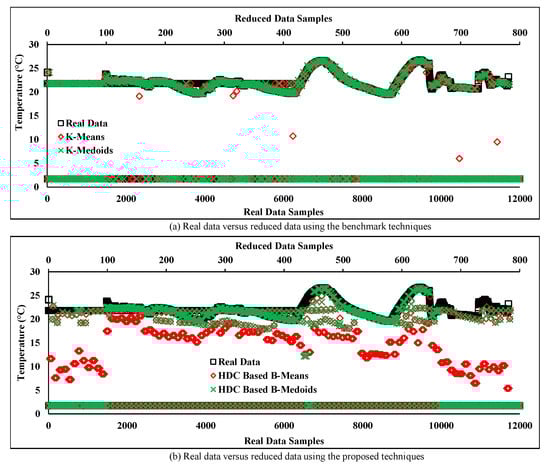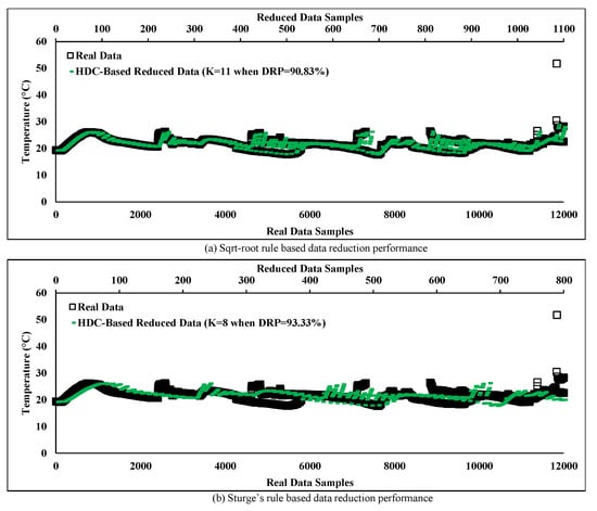 Thirdly, our proposed technique V-RODS with HDC can detect the false outlier and deviation of the reduced data in Figure 16b. This technique detects not only random outliers but also distinguishes frequent outliers by utilizing both the temporal and spatial correlations of the data. Thus, both prototypes of our proposed technique exhibit the similar data pattern as in real data.