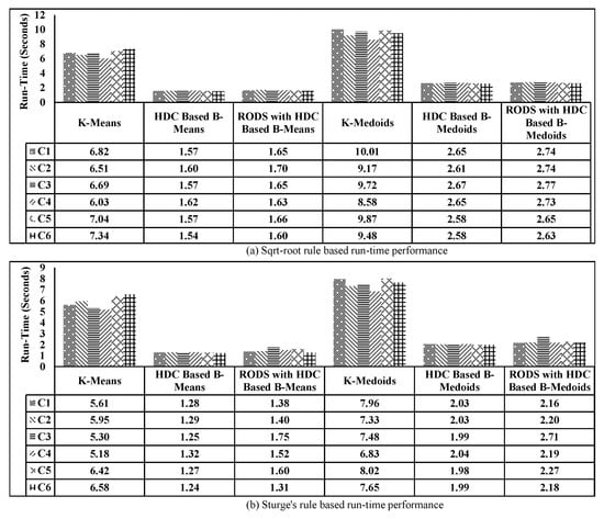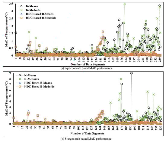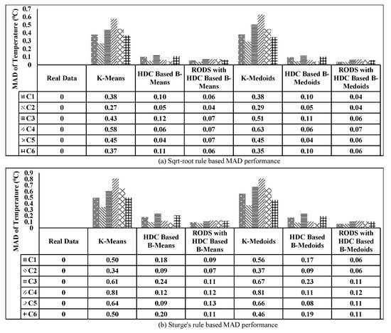 Performance comparison of all evaluated techniques in all selected clusters versus two different rules. (a) MAD versus all selected clusters based on the square-root rule; (b) MAD versus all selected clusters based on Sturge’s rule.