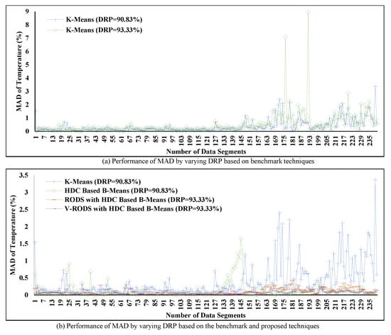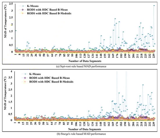 Secondly, the RODS with the HDC technique has been introduced to provide error-aware data clustering by handling the noisy data. One of the most important benefits of this technique is to provide error-bound guaranteed redundancy reduction by maintaining the MAD within the predefined threshold error even under severe noisy data. Furthermore, in our prototypes (B-means and B-medoids), the MAD values are always maintained below the predefined threshold error as indicated by Figure 14a.
