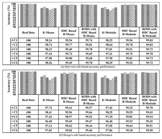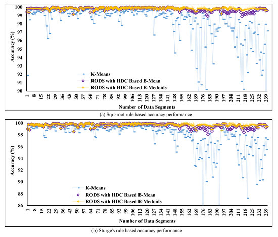Performance comparison of all evaluated techniques in all selected clusters versus two different rules. (a) Accuracy versus all selected clusters based on the square-root rule; (b) accuracy versus all selected clusters based on Sturge’s rule.