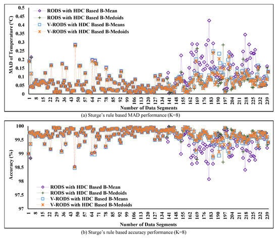 The performance evaluation of the proposed technique was carried out for all the CHs, which is highlighted in Figure 7. The number of connected sensor nodes at each cluster, number of segments, and other parameters are selected the same as C1. Then, the HDC and RODS with HDC-based proposed techniques were evaluated using two different number of K values in terms of accuracy and DRP. Finally, the obtained results of the proposed technique were compared with the results of the conventional techniques and original dataset.