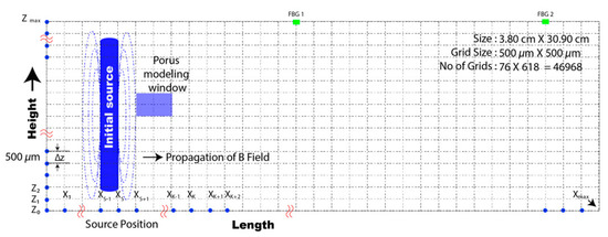 The equivalent form of a two-dimensional solution domain of core flooding was truncated, as seen in in Figure 1. The length and height of the solution domain were 30.90 and 3.80 cm, respectively. The domain of interest was discretized into 46,968 cells, and the dimensions of each cell were 500 × 500 µm. Both etched FBG sensors (FBG 1 and 2) were used to sense the strength of the magnetic field radiated by a solenoid source. FBG 1 and 2 were used to investigate the spectral reflectivity, bandwidth, and side lobes at Bragg wavelengths of 1534 and 1552 nm, respectively. The physical orientation of FBG 1 and 2 was assumed to be 20.0 and 30.0 cm, respectively, in the direction of the x-axis.