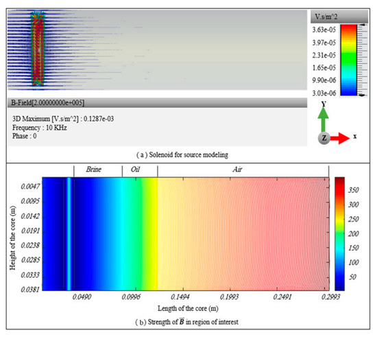 Prior to implementation of our proposed algorithm, source modeling was performed in CST EM Studio (CST2012 version), and the obtained results are shown in Figure 8b. Figure 9 shows the magnetic-field distribution in a porous medium. The intensity of the magnetic field inside our core container was very weak.