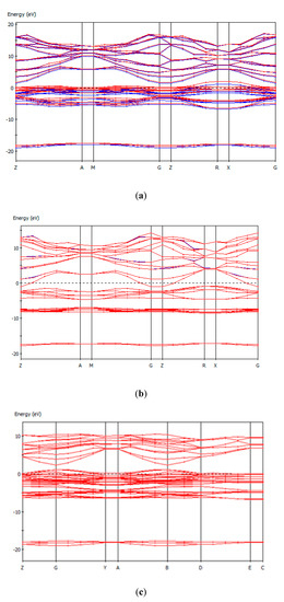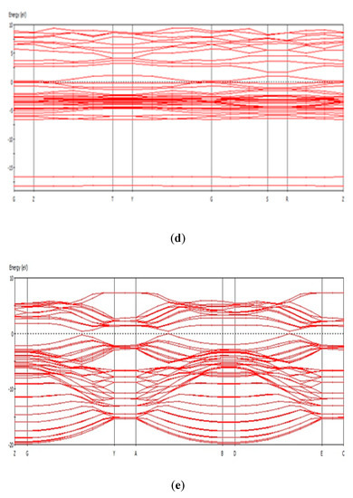 Dielectric materials have a large band gap due to being electrical insulators, exhibiting more energy excitement from valence to covalent bands and allowing electrons to move freely and conduct electricity (Figure 6). The formation of these bands is mostly a feature of the outermost electrons in an atom [42]. Band gaps (Table 1) are essentially leftover energy ranges that are not covered by any band and that resulted from finite widths of energy bands, with widths dependent upon the degree of overlap in the atomic orbitals from which they arise [43].