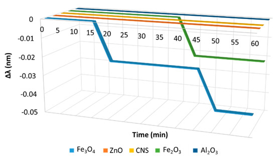 Our research was designed to investigate the effects of FBG through the use of various fluid-based NPs for magnetic transmission at a frequency of 200 kHz. In this manner, we determined the most effective nanofluids that reacted with the FBG. Figure 7 illustrates the graph of FBG wavelength shift versus time as Fe2O3, Fe3O4, ZnO, Al2O3, and CNS were injected.