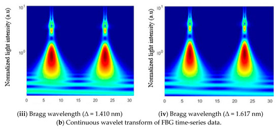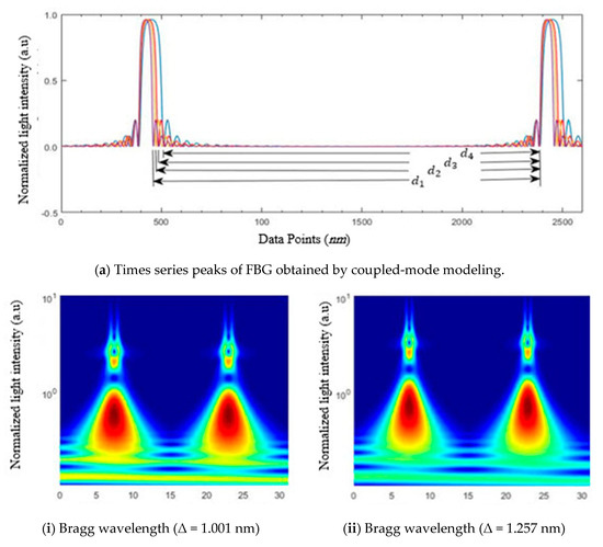 Continuous wavelet transformation was used to investigate temporal changes in the optical data of two consecutive peaks, as illustrated for each case in Figure 8b. The FBG response was a narrow-band reflective filter that was centered at the Bragg wavelength, with the spectral response for uniform FBG affected by grating length and refractivity. Spectral reflectivity was a summation of and , in which was independent of the surrounding environment and constant. However, was dependent on magnetization-force strength sensed by our FBG sensors.