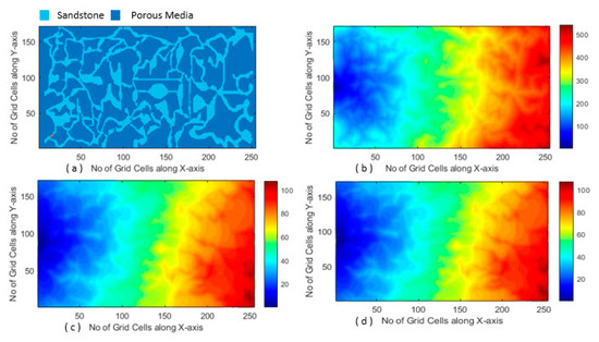 (a) Structure of porous medium and magnetic-field distribution in porous medium filled with (b) air, (c) oil, and (d) brine.