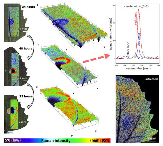 - The high-resolution resonance Raman images of leaves show zones of local increase of carotenoid content relative to the rest of the leaf 48 and 72 h after the herbicide application, surrounding the damaged tissue in the zone of herbicide application, which is an indication of activation defense mechanisms in leaf.
