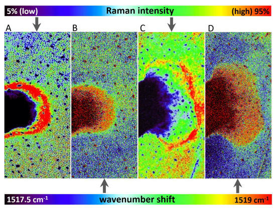 Wavenumber shift was detected after 48 h and 72 h from herbicide application (Figure 3), however, this effect was negligible after 24 h from the application. The depicted images were constructed based on wavenumber shift in the range 1517.5–1519 cm−1.