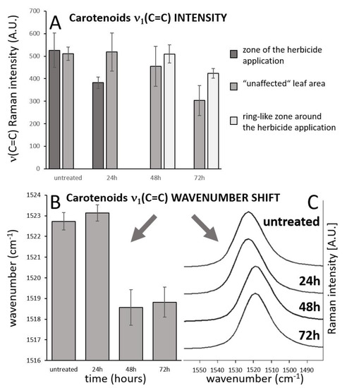 Importantly, overall changes in carotenoid Raman spectral features were obtained from the average of five single spectra randomly selected and extracted from the Raman maps. Both changes in Raman intensity as well as in wavenumber position were registered among the treatments. The Raman ν1(C=C) band intensity decreased within zones, which are out of the area of herbicide application, which moved slightly away from this spot with the prolonged period after herbicide treatment. In the zones around the necrosis (red-cultured ring-like features in Figure 2 and Figure 3) the decrease was smaller with the treatment duration. A substantial temporally resolved wavenumber shift of the ν1(C=C) band was detected from initial values 1522–1523 cm−1 detected within zones out of visible herbicide effect in leaves of untreated plants and also leaves 24 h after treatment, towards values 1517–1519 cm−1, detected 48 h and 72 h after treatment (Figure 4B,C).