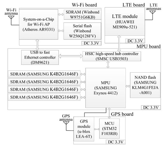 On the MPU board, SDRAMs and a NAND flash are used to support the booting and running of a Linux-based embedded operating system for Exynos 4412. The MPU board connects to the LTE board by USB port and connects to the Wi-Fi board using a fast Ethernet LAN port, so USB3503 and DM9621 are used.