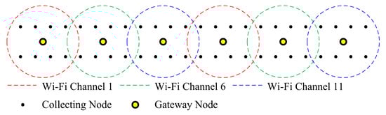 As shown in Figure 5, the coverage distribution is designed to reduce co-channel interference. The collecting nodes start transmission control protocol (TCP) connections when the service set identifiers (SSIDs) of the gateway nodes are detected. Some collecting nodes can detect two or more of the SSIDs of the gateway nodes. A collecting node can choose a gateway node to connect with according to its received signal strength indication (RSSI) values. When all collecting nodes finish their associations with gateway nodes, subnetworks are formed, so the system can operate the seismic exploration functions.