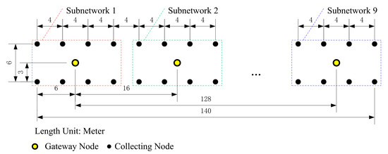 In Figure 7, Subnetwork 1, Subnetwork 2 and Subnetwork 9 are shown in detail. For brevity and clarity, the other subnetworks are replaced by an ellipsis in Figure 7 and each of them had a similar structure to each shown subnetwork. The collecting nodes formed two lines and each line had a length of 140 m. Each gateway node was placed in the center of each subnetwork, and the gateway nodes formed a line with a length of 128 m. In each data acquisition and transmission test operation, all collecting nodes were ordered to execute synchronous 4000 sps 32-bit sampling data acquisition, and the collecting time period was set to 60 s. One shot of the seismic source was executed in each test operation. Ten test operations were done in the experiment.