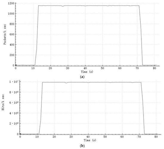 As shown in Figure 8a, the number of received packets per second is around 1152 during the transmission period. For a data acquisition of 60 s, the transmission costs 60.3 s in total. The extra 0.3 s is mainly due to the difference between the communication conditions of the nodes, as some collecting nodes finished the transmissions a little bit later than most of the collecting nodes. As each captured data packet contains extra bytes, the data rate shown in Figure 8b is higher than 9.216 Mbps.