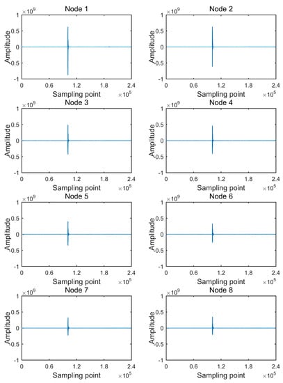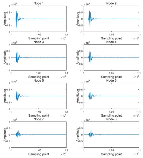 In Figure 9, “Amplitude” is the 32-bit sampled code value. Each waveform is composed of 240,000 sampling points, which is the complete number of sampling points of a collecting node for a 4000 sps 32-bit sampling acquisition of 60 s. The direct wave of each waveform is between the 100,000th sampling point and the 110,000th sampling point, and detailed direct waves are shown in Figure 10.