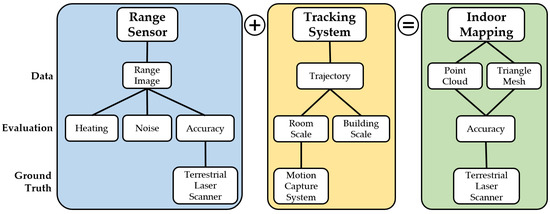 Schematic overview of the evaluation of the Microsoft HoloLens as indoor mapping system with range sensor and tracking system as the relevant subsystems constituting it.