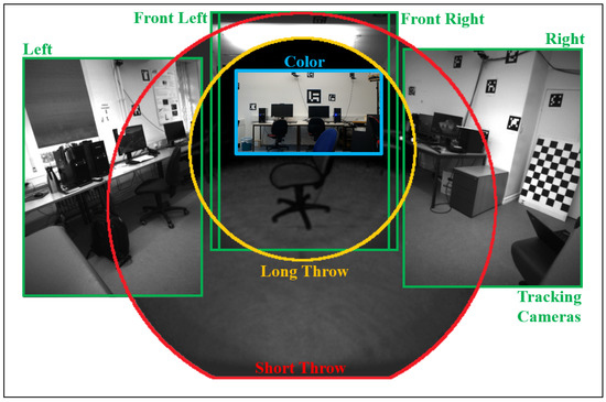 The Microsoft HoloLens device is equipped with various imaging sensors providing data necessary to accomplish the different tasks constituting its mobile indoor augmented reality system such as tracking, re-localization in known environments and capturing the geometric structure of its surroundings by means of depth sensing. Table 1 gives an overview of these camera sensors and their respective characteristics, while Figure 2 shows an overlay of images recorded by those sensors to give an impression about their arrangement on the device.