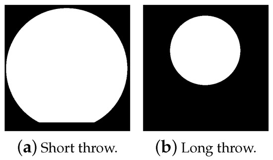 Pixels actually containing values are shown in white for short throw and long throw mode.