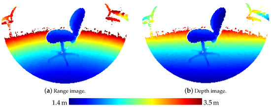 Figure 4 shows the range and depth image respectively corresponding to the reflectivity image for the long throw mode of the ToF camera shown in Figure 2.