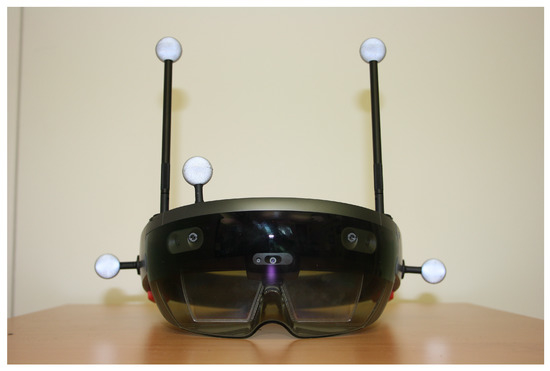 For assessing the tracking capacity of the HoloLens, the optical motion capture system OptiTrack Prime 17W [34] with eight tracking cameras in a laboratory room with a size of approximately 8 m × 5 m × 3 m was used to get ground truth data. For this purpose, the HoloLens device was equipped with a rigid body consisting of five reflecting sphere markers trackable by the motion capture system as depicted in Figure 6.