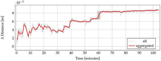 In this section, we present the results of the evaluation of the HoloLens ToF range sensor as described in Section 2.2.1. Figure 7 shows the variation of the measured range value over time during the warm-up process of a completely cooled-down device relative to the first range measurement. In the first 40 min after the beginning of the measurements, the range value is subject to strong fluctuations in the range of few millimeters. Afterwards, from about 40 to 60 min, the range value remains more or less constant at a value of 6 mm above the initial value. Then, at a measurement time of about one hour, the measured value rises again by two to three millimeters accompanied by strong fluctuations. Afterwards it remains stable with a slightly increasing trend for the rest of the measurement.