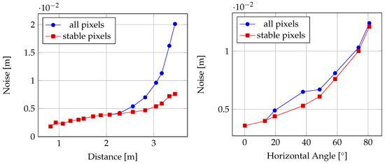 Table 2 on the other hand shows the results of the investigation of sensor noise against distance and inclination of a captured plane. The given values for noise are calculated as mean standard deviations of the measured distance values over all pixels. The sensor noise is calculated once for all pixels on the captured wall surface and once only for those pixels that contain range values in at least 75% of images of a respective recording. The results are further visualized in Figure 8.