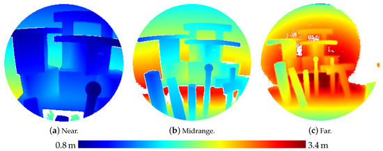 Depth images derived from the HoloLens ToF sensor for the three-dimensional scene depicted in Figure 5 captured from three different distances.