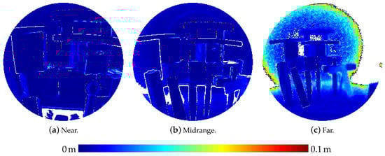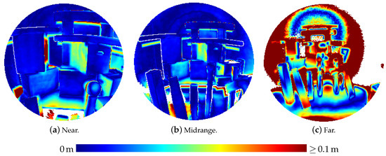 Table 3 presents the results of the evaluation of the three-dimensional scene depicted in Figure 5. The results are also visualized in Figure 9 as depth images, while Figure 10 visualizes the noise and Figure 11 the accuracy of the range measurements evaluated against TLS ground truth data for all three distances the scene was captured from by the HoloLens range sensor (near, midrange and far). Furthermore, Figure 12 visualizes the accuracy of the HoloLens triangle mesh of the same scene evaluated against the TLS ground truth data.